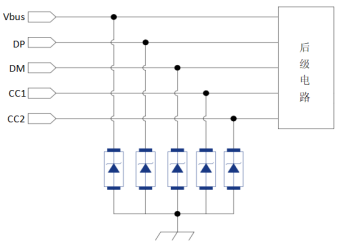 充電功率從5V/3A逐步提升至36V/5A,用于充電功能的關(guān)鍵線路(如USB-A中的Vbus、DP、DM,以及USB-C中的Vbus、DP、DM、CC1、CC2)成為防護(hù)的重點(diǎn)。EOS浪涌和ESD可能通過(guò)這些線路侵入后級(jí)電路,甚至因插拔操作產(chǎn)生的浪涌也可能導(dǎo)致主控芯片損壞。